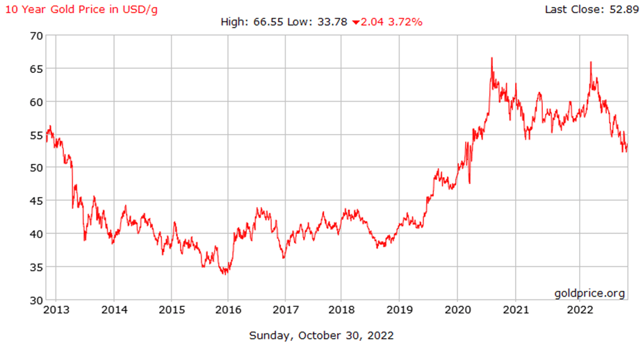 | Evolución del precio del Oro. Gramo en dólares 2013-2022 (octubre 30, 2022) |